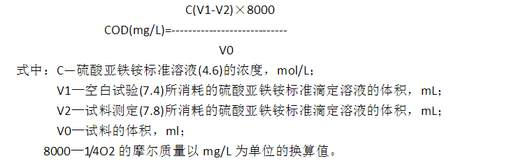 7.5 空白試驗:按相同步驟以20.0mL水代替試料進行空白試驗,其余試劑和試料測定與(7.8)相同,記錄下空白滴定時消耗硫酸亞鐵銨標準溶液的毫升數V1。 7.6 校核試驗:按測定試料(7.8)提供的方法分析20.0mL鄰苯二甲酸氫鉀標準溶液(4.7)的COD值,用以檢驗操作技術及試劑純度。